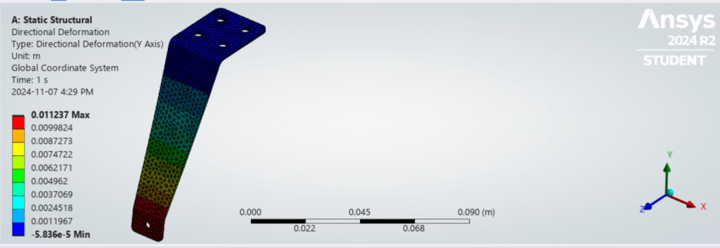 Next, the geometry was imported into ANSYS to simulate the vertical deflection under the assumed load/landing conditions. The composite material of wet layup woven carbon fiber was selected as it was the one used for making those landing gears.