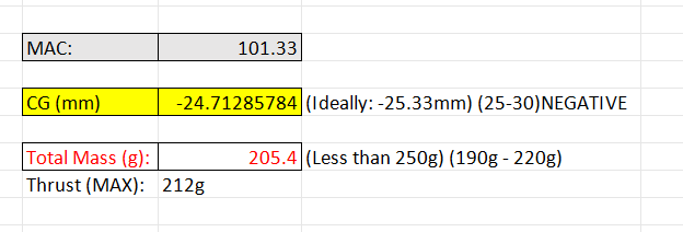 CG location was set to be 1/4 of the chord length from the wing’s leading edge and the CG balancing/mass distribution was calculated in the Excel tool I built which takes the mass and location of each individual component and gives an output of the CG location.