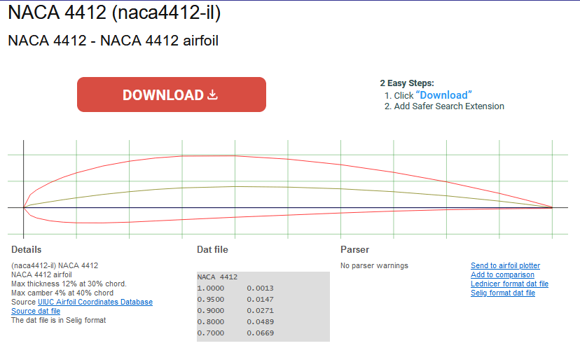 For this design, NACA 4412 airfoil was chosen as this airfoil, as an asymmetrical airfoil, it produces more lift and less drag than symmetrical ones under the same conditions. Most importantly, they can produce lift with zero attack angle! The design does not aim to fly upside down, and the thrust-weight ratio was estimated to be 0.9 which is high enough for the normal performance. The airfoil curve was later downloaded into the Excel sheet for SolidWorks CAD.