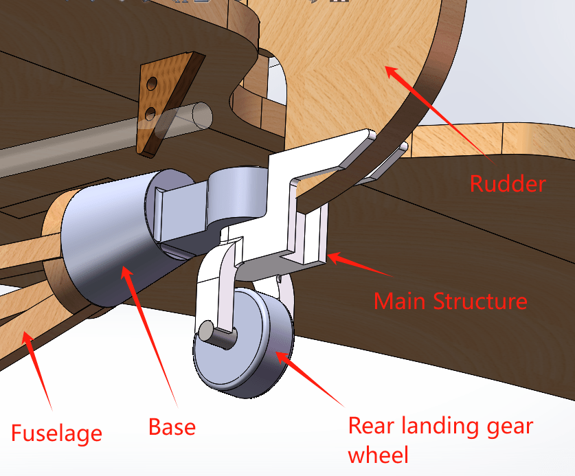 The rear landing gear base was mounted on the end of the fuselage, to synchronize the control of the rudder and the rear landing gear (the rudder has less effect than the rear landing gear on the ground for turning during taxiing), the rear landing gear main structure has a “fork” shape which can be mounted on the rubber to achieve the synchronization.