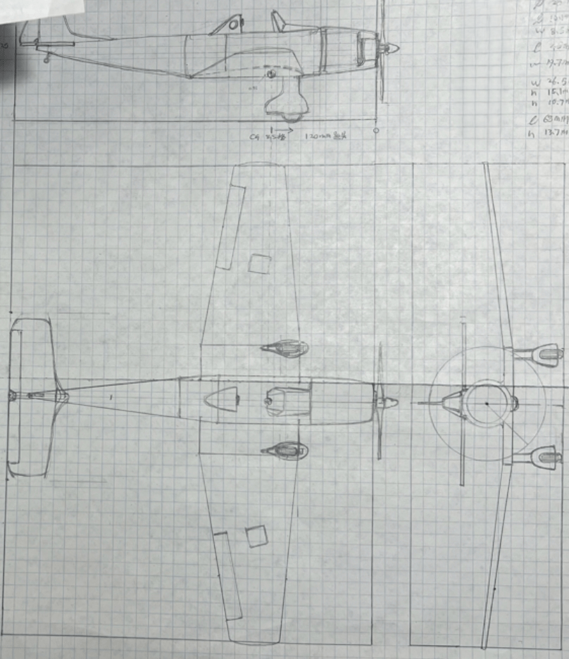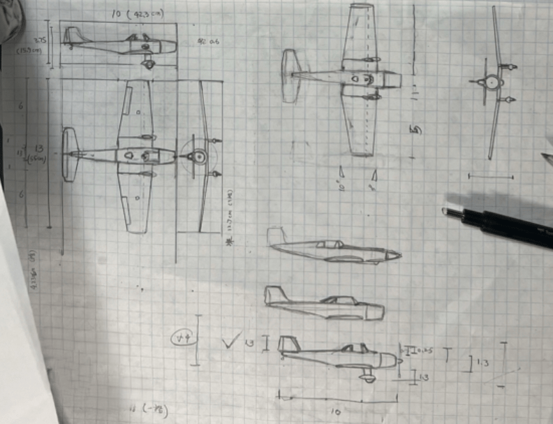 The design started with some simple sketches on paper … I evaluated a few combinations and then picked this design layout (it was the most feasible idea for my first balsa wood plane design). Then, the sizing and basic design layout of the plane were done right after this. I referenced some design sizing of the existing planes and some design guidelines. Later, the layout design was enlarged to make it easier to see and have more detail (I made a reference ruler to help with scaling up the sketch).