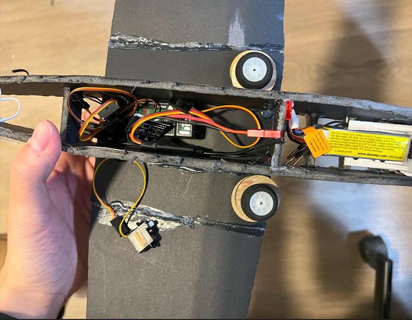 After the finish of the wing’s CAD, we moved to the fuselage detailed design in CAD. However, before that, I had to determine the specific locations/layout for batteries, servos, receivers, wiring, etc. Since the plane is small, the fuselage is very packed, and where to put which component needs to be considered carefully. Moreover, each individual component has to be accessible for later maintenance and replacement (Picture down below).